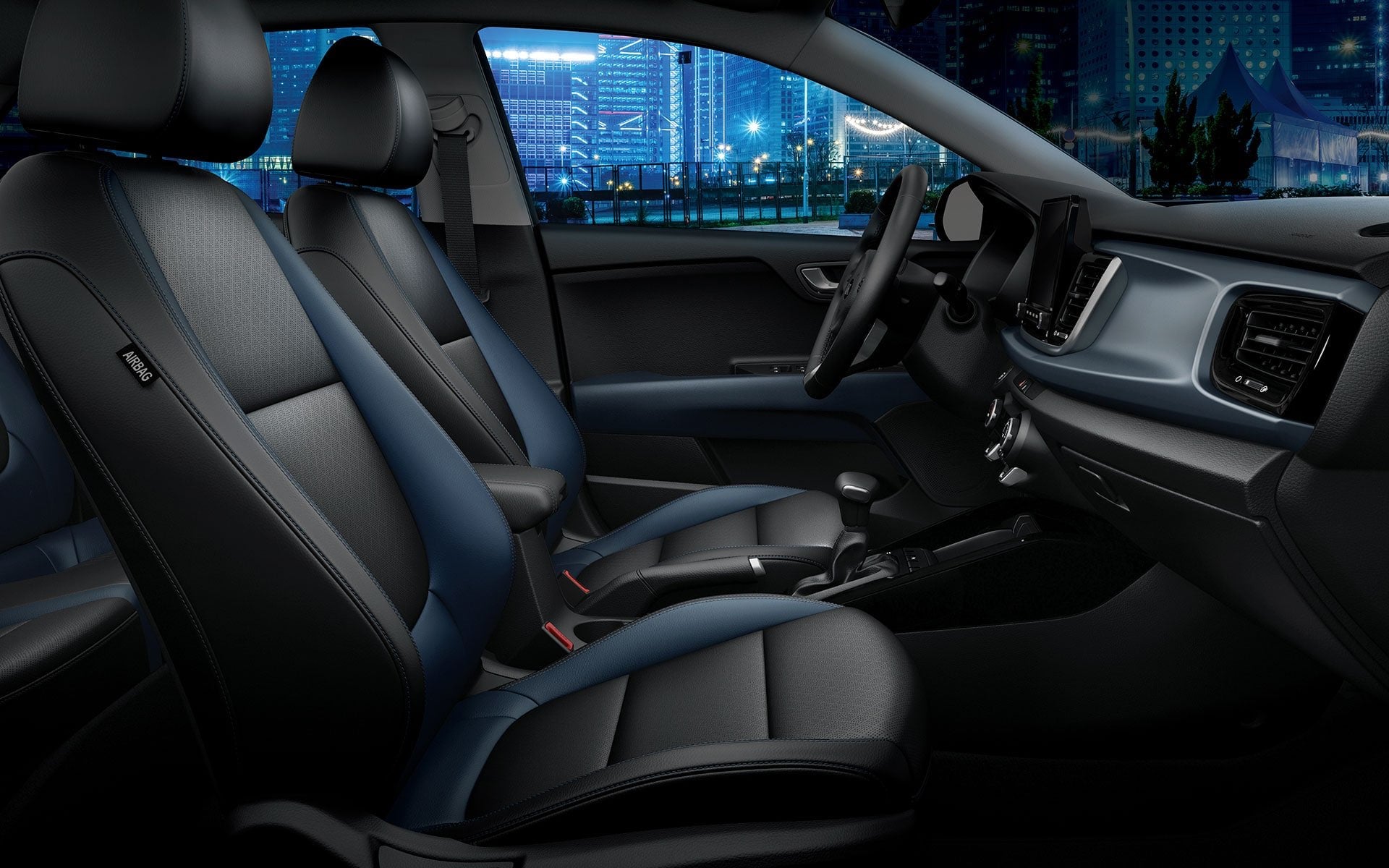 - Vestiduras de asientos en piel bitono (negro/azul).